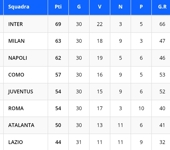 SERIE A - La classifica provvisoria: l'Atalanta consolida il settimo posto, ottava la Lazio